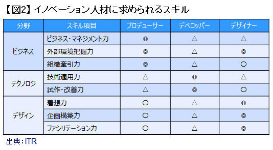 それでは、これら3つのタイプの人材は、どのようなスキルを具備していることが求められるのだろうか。イノベーションの創出および推進では、ビジネスとテクノロジを結び付け、アイデアを具現化していくことを考えると、大きく「ビジネス」「テクノロジ」「デザイン」の3つの領域のスキルが必要となると思われる(図2)。