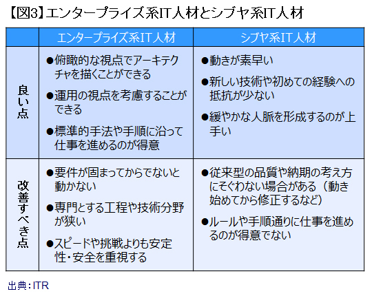 これも、一概にはいえないことだが、エンタープライズ系とシブヤ系のIT人材の特徴を表にまとめてみた(図3)。