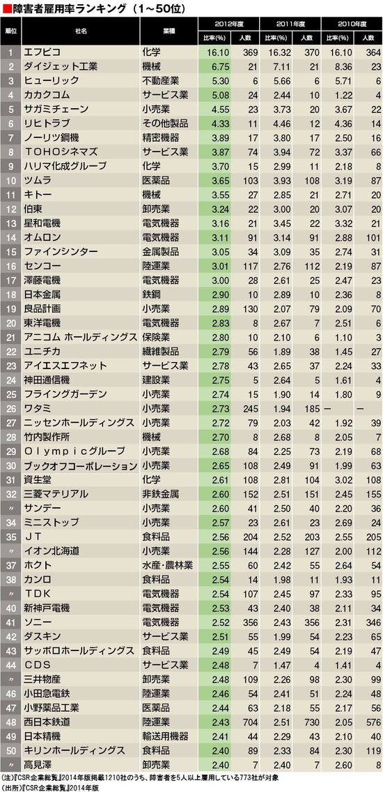 1位は食品トレーや弁当・総菜容器最大手のエフピコとなった。障害者雇用率はダントツの16.10%で障害者雇用実人数も369人と多い。2010年度16.10%(同364人)、11年度16.32%(370人)と他社を寄せつけない圧倒的な水準を維持している。