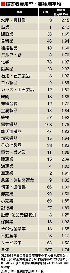 続いて業種別の集計を見ていこう。こちらは12年度の障害者雇用率を開示している967社が対象。全体の平均は1.74%だった。
