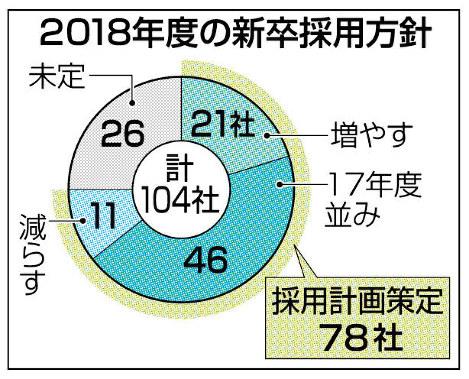 共同通信社は、主要104社を対象にした2018年度(18年4月~19年3月)入社の新卒採用方針アンケートの結果をまとめた。既に採用計画を固めた78社のうち、27%に当たる21社が17年度実績(見込み)と比べて増やすと回答し、前年調査(24%)を上回った。