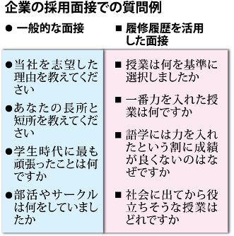 大学側も動きに敏感だ。関西学院大学は昨年から学生らに向けた就職活動説明会で、企業側が履修履歴を採用に活用していることに触れてきた。小山裕正キャリア支援課長は「大学での学びやゼミ活動が自分をアピールする際の強みにもなることを学生に意識してほしい」と話す。