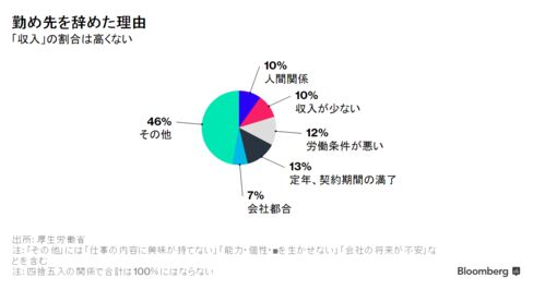 日本の労働者が仕事を辞める理由は、賃金よりも人事配置や長時間労働など職場の不満が目立つ。厚生労働省が実施した調査によると、前職を辞めた理由として賃金と答えたのは約10%にとどまった。米リンクトインが15年に実施した国際的な調査では、34%が賃金の不満を挙げているのとは対象的だ。