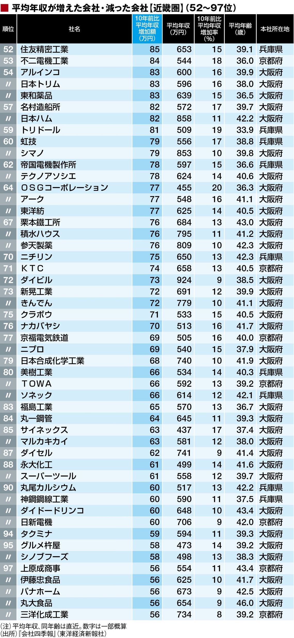 東洋経済オンラインは、主要な上場企業が過去10年にわたってどれだけ従業員の平均年収を増減させたかを調査。全国のトップ500社、ワースト500社に続いて、本社所在地で見て全国7地域別(北海道・東北、東京除く関東、東京、中部、近畿、中国四国、九州沖縄)のランキングを作成した。