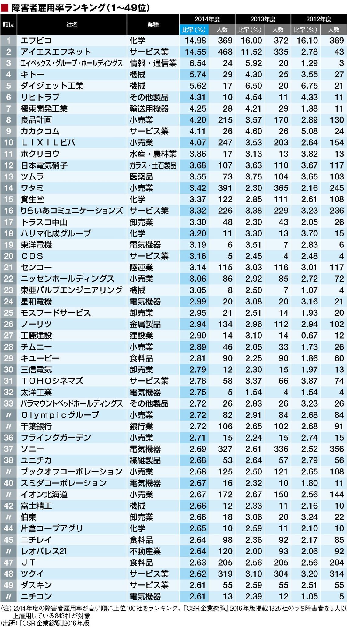 ランキング1位は3年連続で食品トレーや弁当・総菜容器最大手のエフピコ。ダックス、ダックス四国といった特例子会社を持ち、障害者雇用率は14.98%と高く人数も369人と多い。2012年度16.10%(同369人、以下同様)、2013年度16.00%(372人)と圧倒的な水準を維持している。