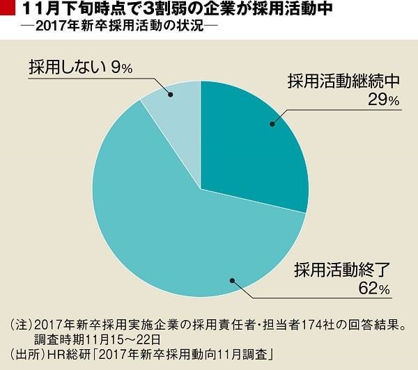 企業は採用に苦戦している。採用活動解禁日(今年6月1日)から半年経った11月末時点でも、全体の29%が2017年卒の新卒採用を継続している。この種の調査としては珍しく、企業規模や業種の違いはほとんど出ていない。