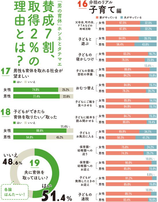 【堀込】なぜこの差が生じるかというと、男性は家事・育児の「全量」を把握していないから。だから少し手伝っただけでも、ずいぶんやった気になってしまう。全量を知るためには1週間でもいいから男性が育休を取って、「子育てや家事ってこんなに大変なんだ」ということを体験してもらうといい。そうすれば心からの感謝の言葉が出てくるだろうし、妻も「9対1でも仕方ないか」という気持ちになるかもしれない。男の勝手な解釈だけど。