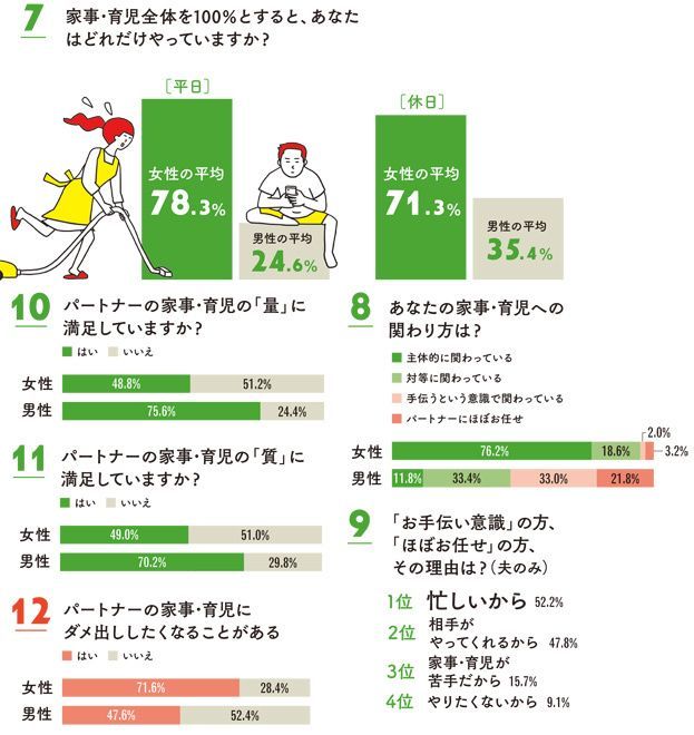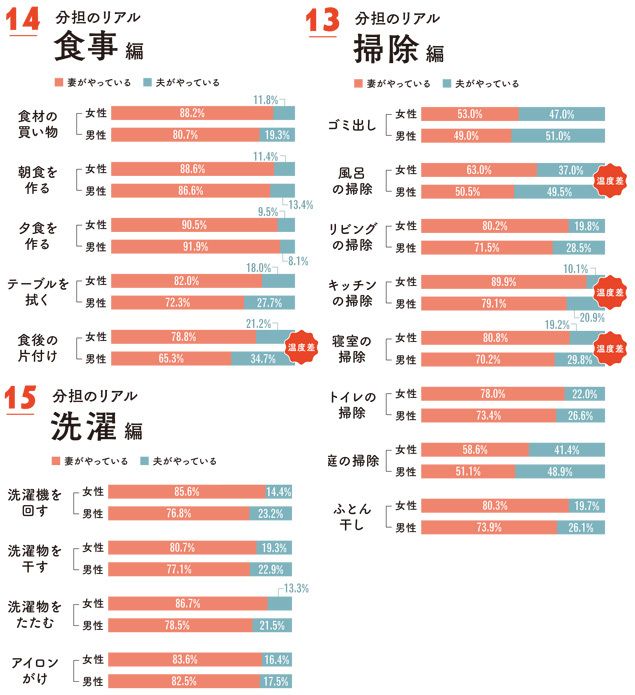 【堀込】時間とか配分の問題というより、心構えの問題ですね。それにしても分担状況を細かく見ていくと、妻たちの負担の大きさと怒りが、そこかしこから伝わってきます。男って、たまに家事をやると、それを偉そうにひけらかすでしょう(笑)。そういうところも妻の怒りを買ってますよ。