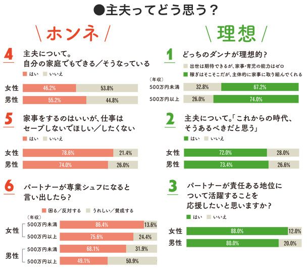 【白河】いまの女性は家事・育児、仕事を一身に背負っていますからね。でも私が今回のアンケート結果で気になったのは、妻の矛盾です。夫に家事や育児を期待しているわりに、稼ぐほうの手も抜いてほしくないと思っている。ただ、年収別に見ると、500万円以上の高収入女性のほうが、「稼ぐ夫より家事や育児をする夫のほうがいい」と答えているのは面白いですね。