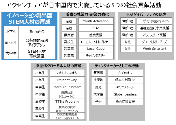 アクセンチュアは全世界で「2020会計年度末までに世界中で300万人に就業や起業に関わるスキル構築の機会を提供すること」を掲げ、社会貢献活動を展開。日本では5つのテーマで活動を推進しているこれまで、アクセンチュアでは、横浜市立飯島小学校、大熊町立熊町小学校で実施したロボティクス授業や、会津大学、慶應義塾大学でのデータサイエンティスト講座の提供、高校生、高専生、大・大学院生を対象とした「データビジネス創造コンテスト」の開催支援など、幅広い層に対して、STEM人材の育成プログラムを提供してきました。