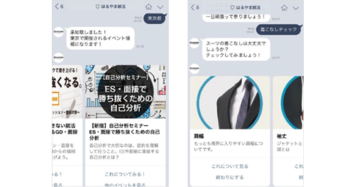 これらの支援を通じて得られたノウハウと、AIチャットボット機能を用いた「はるやま就活」LINEアカウントを通じて、就活生が必要とする様々な情報を提供していく。