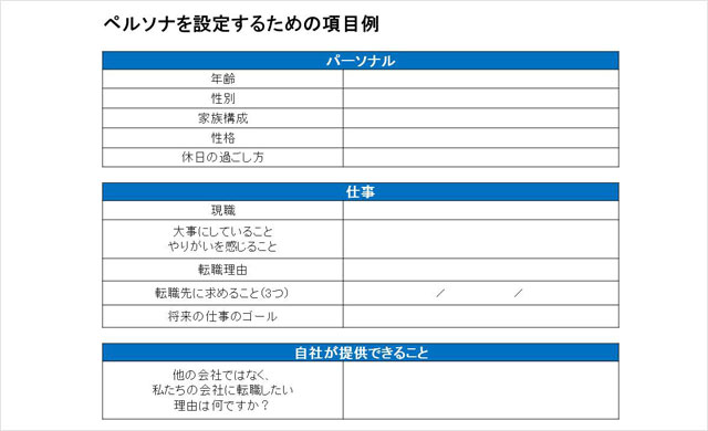もっとも「ペルソナ設計」は人事だけで行っても、上滑りしたものになる可能性があります。採用戦略に基づき、経営層、採用ポジションの責任者とのすり合わせが必要です。具体的な設計ですが、性別や年齢をはじめ、今どんなことをしていて、なぜ転職を考えたか、転職先に何を求め、将来どうなりたいか、などを想像し紙に書いていきます。