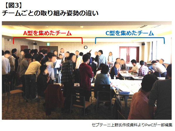 上野 繰り返しになってしまいますが、社内にこの仕組みを啓蒙し、使いたいと感じてもらう環境づくりですね。そのために色々なことをやりましたね。例えば、マネージャー研修の際には、データ分析によってグループ化された同じパーソナリティをもった社員でチームを組んでビジネスゲームを行ったのですが、それぞれのチームよって明確に取り組み方に違いが出てきます。その違いを実際に社員が体験することで、データ分析の面白さや確からしさをまず強烈に認識してもらい、その上で実務ではそれをどう使うべきかをトレーニングしました(図3)。