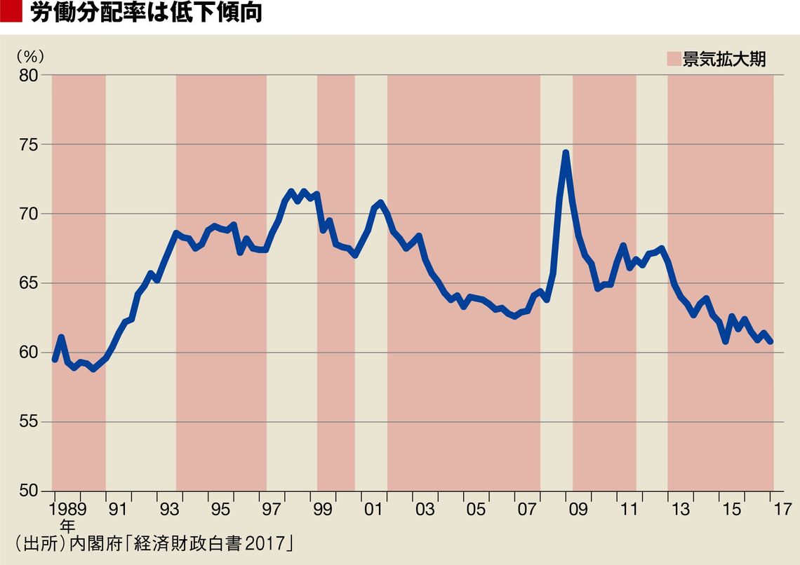しかし現状では、多くの企業は雇用には前向きになってきたものの、賃上げにはまだ慎重です。それを端的に示しているのが、労働分配率の低下です。今年の「経済財政白書」によると、法人企業統計をベースにした労働分配率は2017年1~3月期で60.8%と、2015年4~6月期と並んで26年ぶりの低水準となっています。