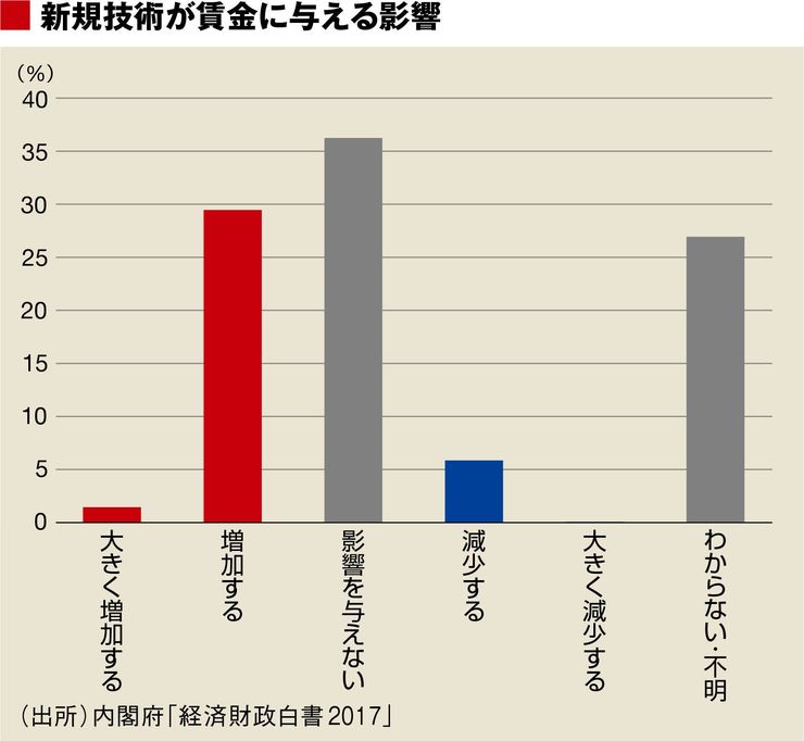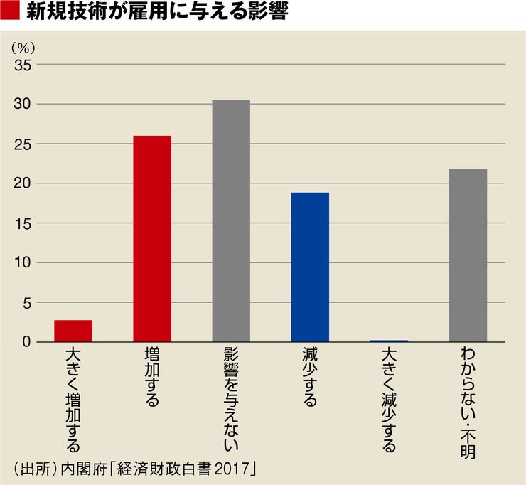 この点について、今年の「経済財政白書」が興味深い分析をしています。同白書によると、新規技術を導入・検討している企業に雇用への影響を聞いたところ、全体では「影響を与えない」との回答が最も多かったものの、次に「増加する」との回答が26%を占めました。「大きく増加する」との回答も合わせると29%となり、「減少する」「大きく減少する」との回答(合計19%)を大幅に上回りました。