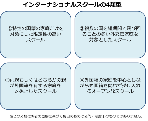 その中には、1)特定の国籍の家庭だけを対象にした限定性の高いスクール(アメリカンスクール、インディアンスクールなど)から、2)複数の国を短期間で飛び回ることの多い外交官家庭を対象としたスクールや、3)両親もしくはどちらかの親が外国籍を有する家庭を対象としたスクール、4)外国籍の家庭を中心としながらも国籍を問わず受け容れるオープンなスクールまで存在し、その種類は幅広い。