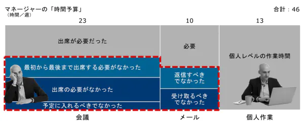 ベインが米マイクロソフトの労働環境分析ツールを活用してグローバル企業308社を対象にした調査では、管理職の1週間の平均労働時間は46時間。そのうち会議が23時間、メールが10時間(オンラインのチャットも含む)。彼らが会議や電子メール対応を除いた1週間のうち自分でじっくり物事を考えられるのは、約13時間しかない。