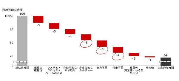 日本企業は特に、「時間」の無駄が諸外国にくらべ高い。ベインとプレジデント社の合同調査によると、日本企業は大企業病による影響で31%の時間が失われている。ベインのパートナー、石川順也氏は、「個人の生産性が低いわけではない。全員のコンセンサスを取ろうとする組織文化が、時間の無駄を生んでいる」と指摘する。