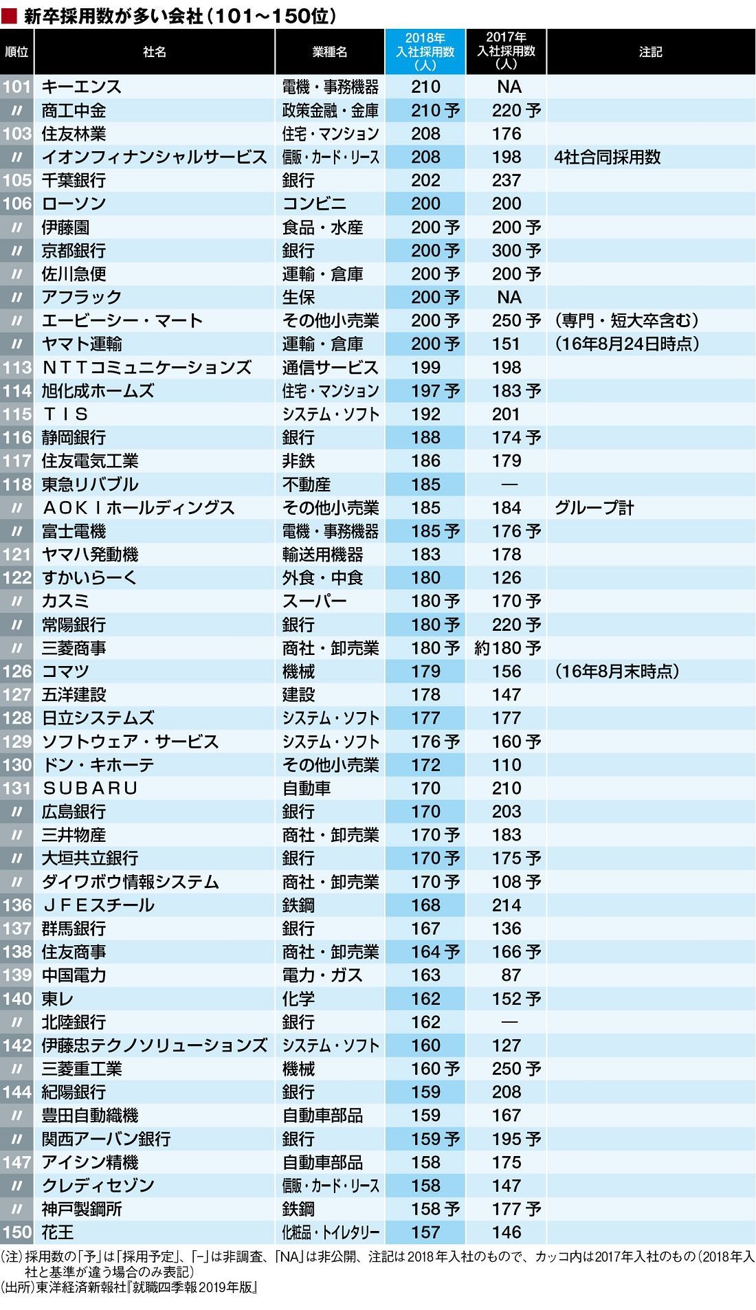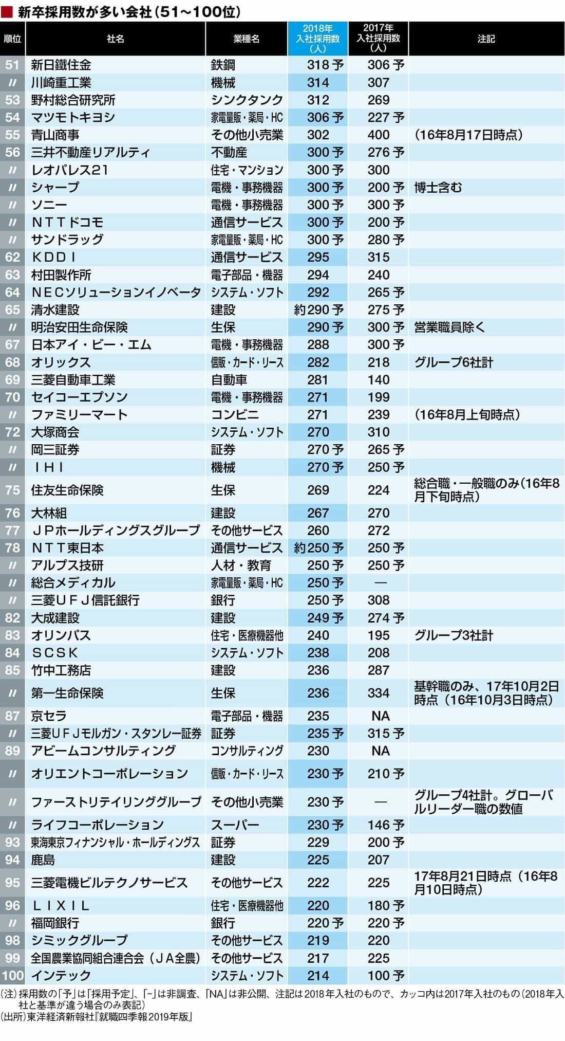 東洋経済が2017年11月23日に発売した、『就職四季報2019年版』(「総合版」に加え「女子版」「優良・中堅企業版」がラインナップ)から、新卒採用が多い企業を調査・集計し、上位200社を今回ランキングした。対象は「総合版」掲載の1293社のうち、「修士・大卒採用数」(2018年4月)に有効回答があった1253社だ。なお、2017年8月に調査を実施しているため、その時点での内々定者数、予定・計画数の場合がある。また表には前年調査データ(「修士・大卒採用数」(2017年4月)・2016年8月実施)も付した。