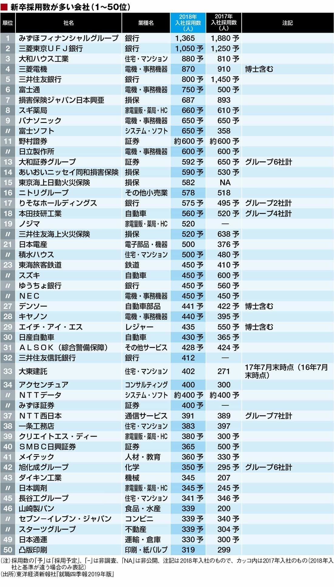 最新版「新卒を多く採用する会社」トップ200 1位みずほ、3位が大和ハウス、4位は三菱電機