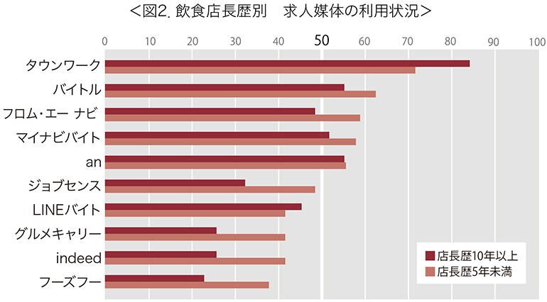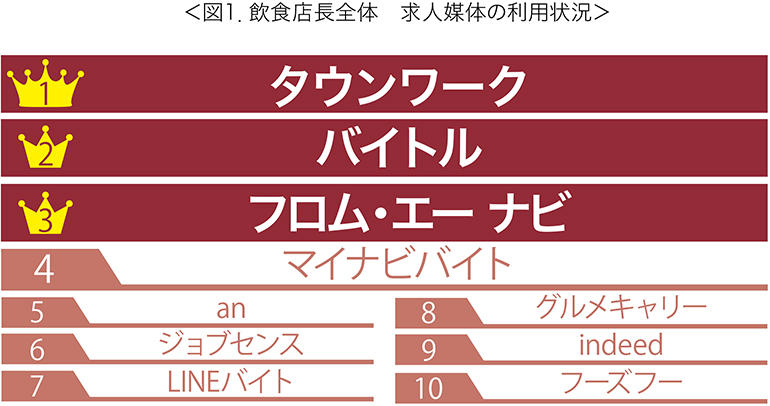 利⽤媒体の1位はタウンワーク。2位がバイトル、以下、フロム・エー ナビ、マイナビバイト、anとトップ5は全国メジャー媒体が名を連ね、9位に某有名芸能⼈のCMで話題のindeedがランクインする結果となりました(図1.飲⾷店店⻑全体 求⼈媒体の利⽤状況)。