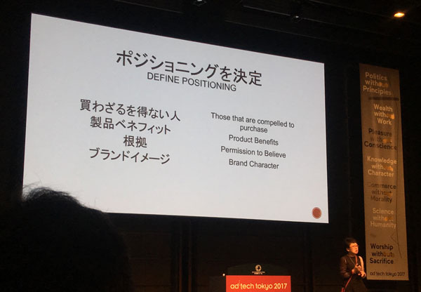 次に掲げるのは、ディマンドクリエーションの概念だ。自分たちのブランドがまだ世に出ていない場合、既に他のブランドを使っているユーザーにニーズを感じてもらい、こちら側を選んでもらうこと。その際には、ポジショニングを規定することが欠かせない。「ポジショニングとは、存在するスペースはあまたあれど『私はここにしかいない』という決意の表れ。皆、決定するのを怖がりますが、絞り込まないとマーケティングになりません」と和田氏は強調する。
