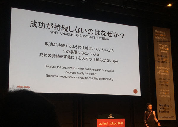 では、成功が持続しない理由とは? 和田氏は、「そのように仕組まれていないから。今日参加されている方の中にも、ブランドの成功を『自分が加わったから成功した』と思っている人がいるでしょう。でも、その人が抜けるとうまくいかなくなるのは、属人的な成功です。マーケティングを成功させるだけでは、50点。そのノウハウを部下や周囲の人に授けている、つまり周囲を育成していて初めて100点満点になります」と指摘する。