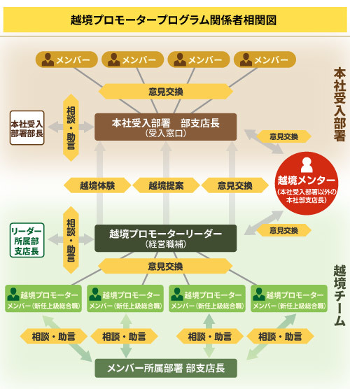 「越境プロモータープログラム」は簡単に述べると、地区本部・工場から公募で選ばれたリーダーとメンバーによる「越境チーム」が今の所属部署に在籍しながら、希望する本社の部署の実務を3日間体験する。その体験を元に、「越境」した本社部署が抱える課題解決に向けて、4ヵ月間に渡って提案をするというプログラムである。