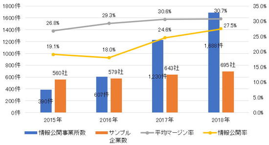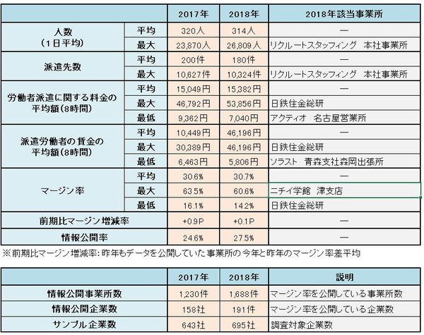 今回、筆者は一般社団法人・日本人材派遣協会(JASSA)の登録企業ほか大手数社、計695社の派遣会社をサンプルとして選び、マージン率の数値とその公開の有無を調べました。今年の調査結果一覧と2015年以降の諸データの推移は下の図の通りです。