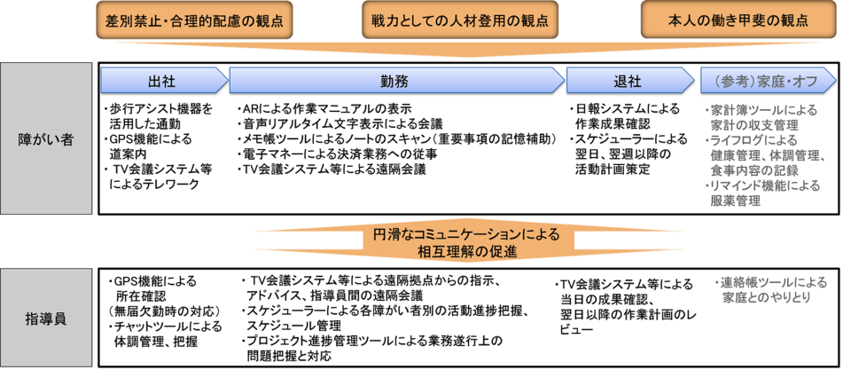また、以下の図は、出社から退社までの流れの中で、ITがどのように障がい者の活躍に寄与しうるかを例示したものだという。