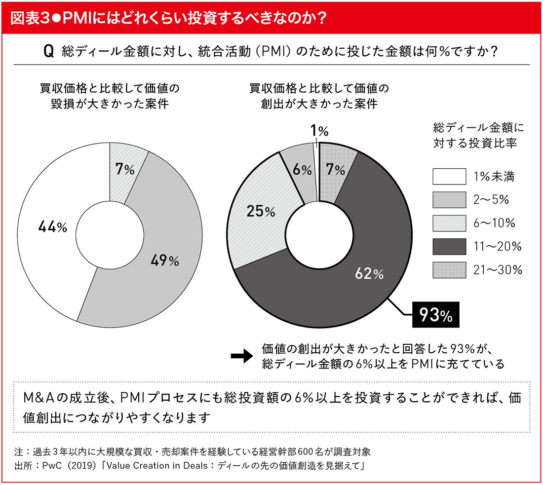 M&Aを成長戦略と捉え、狙いどおりにシナジーを生み出していくためには、PMIプロセスで起こる「人と組織の課題」について、なんらかの取り組みが必要です。実際、図表3のとおり、M&Aの投資額の6%以上をPMIに投資することで、価値創出の度合いを大きく高められる、というデータもあります(*3)。PMIプロセスでは、人と組織の課題にどう対処するか、組織・職場づくりをいかに計画的に行っていくかが、M&Aの成功率を高めるカギになります。