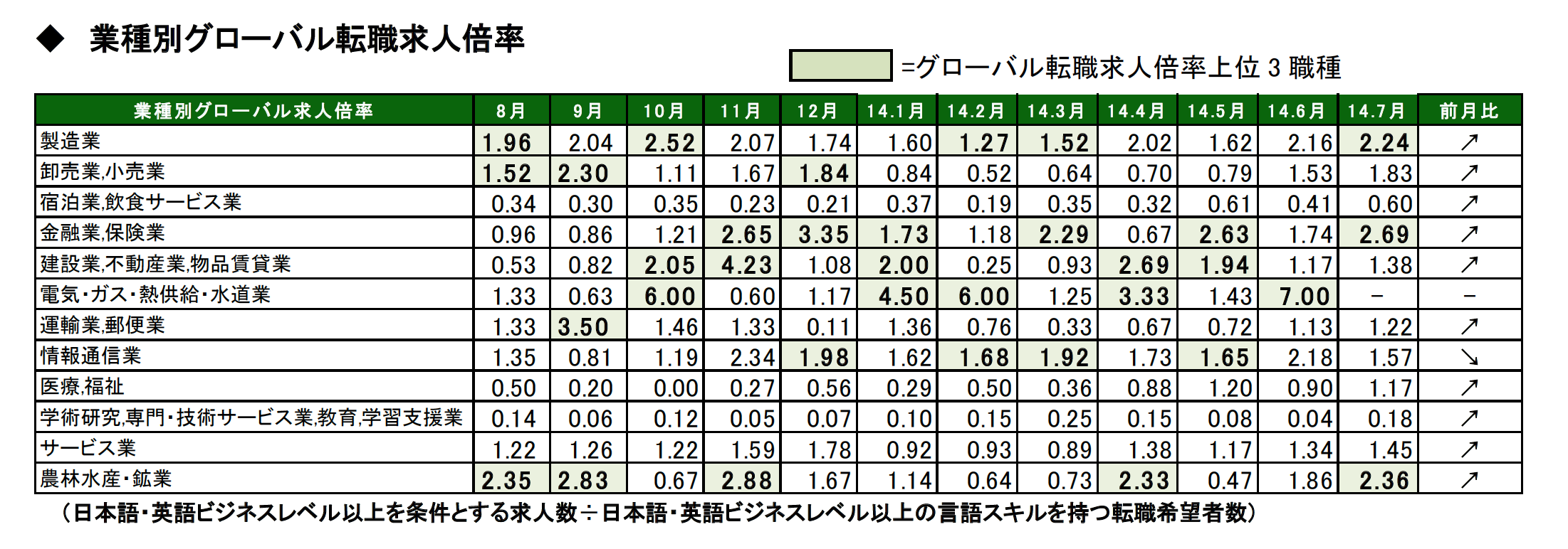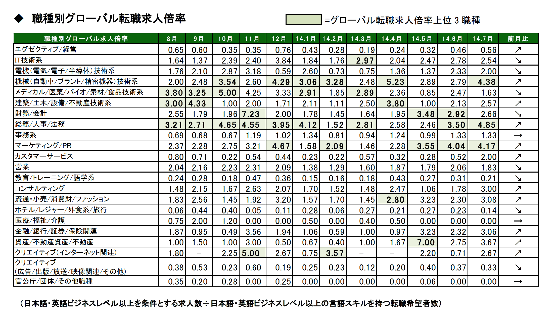 ヒューマンホールディングス株式会社の事業子会社で、バイリンガルのための転職・求人情報サイトDaijob.comを展開するダイジョブ・グローバルリクルーティング株式会社(本社:東京都新宿区、代表取締役:篠原 裕二)は、2014年7月末時点でのグローバル転職求人倍率をまとめました。