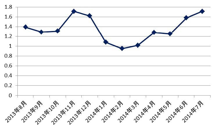 7月度は全体でのグローバル転職求人倍率も1.71倍と昨年11月以来の高倍率となりました。2014年5月度は前月比3%下回りましたが、2014年2月以降、全体的に倍率は上昇傾向にあると考えられます。