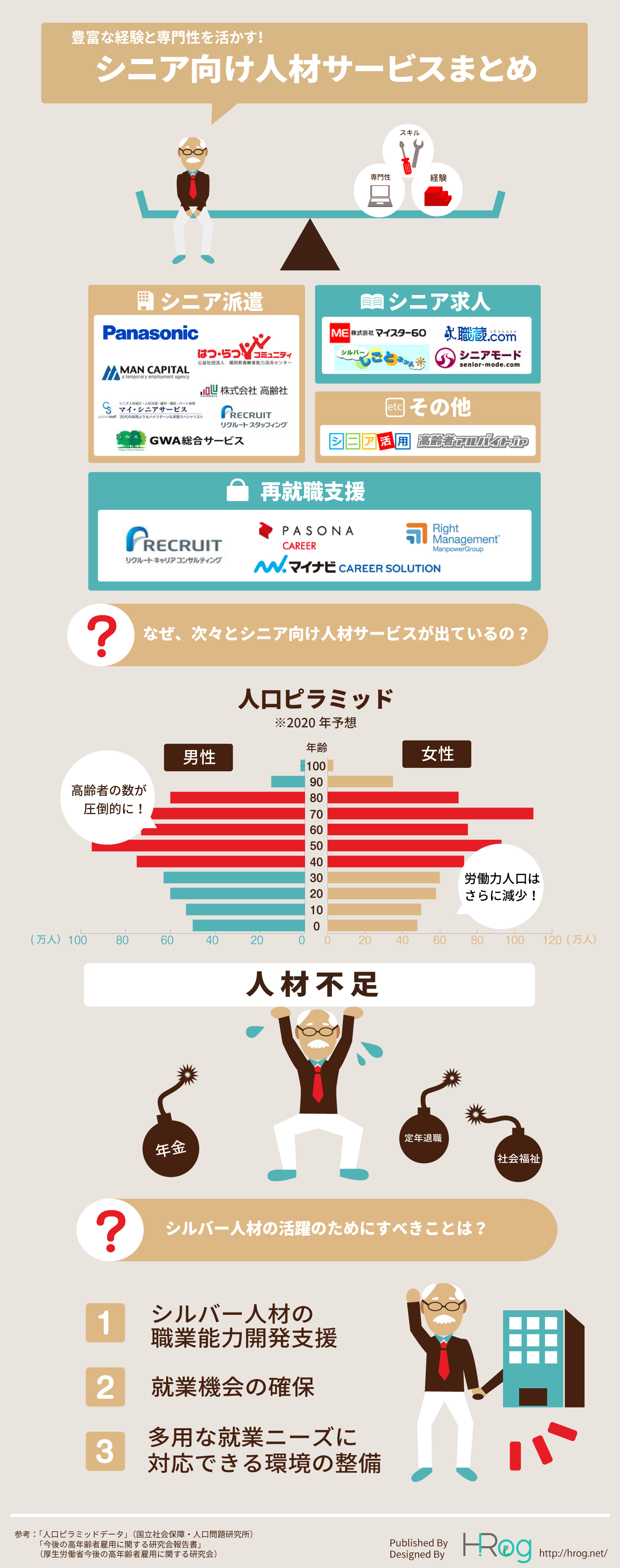そこで今回はシニア人材の就業を支える人材サービスをインフォグラフィックでまとめてみました。ぜひご覧ください!