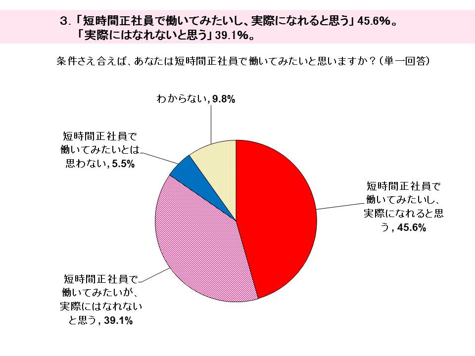 一方「短時間正社員で働いてみたいが実際にはなれないと思う」との回答が39.1%に上り、実際に短時間正社員になるためには様々な課題があることも感じる結果となりました。