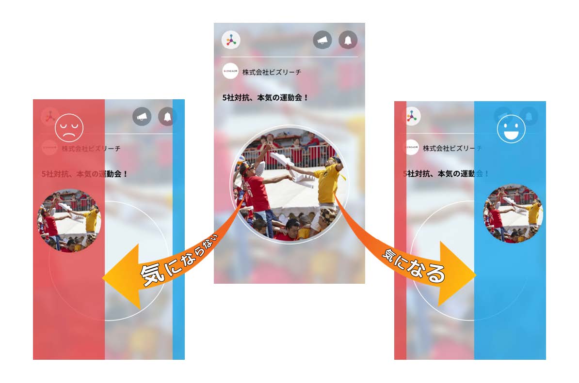 ユーザーには、初期登録で入力された属性情報に基づき、「1日最大10社」が「毎日」レコメンドされます。ユーザーは、レコメンドされた10社について、「気になる」or「気にならない」をフリックで選択していきます。
