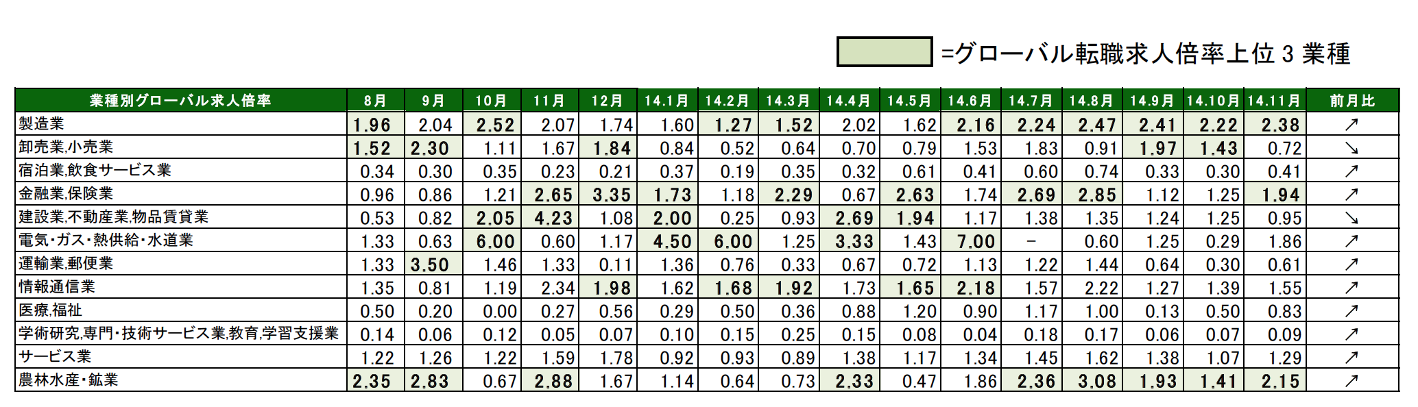 グローバル転職倍率を業種別に見てみると、「製造業」が 2.38 倍、前月比 0.16 ポイント増加しトップ。「農林水産・鉱業」が 2.15 倍、前月比 0.74 ポイント増加。「金融業、保険業」が 1.94 倍で 0.69 ポイント増加という結果になりました。