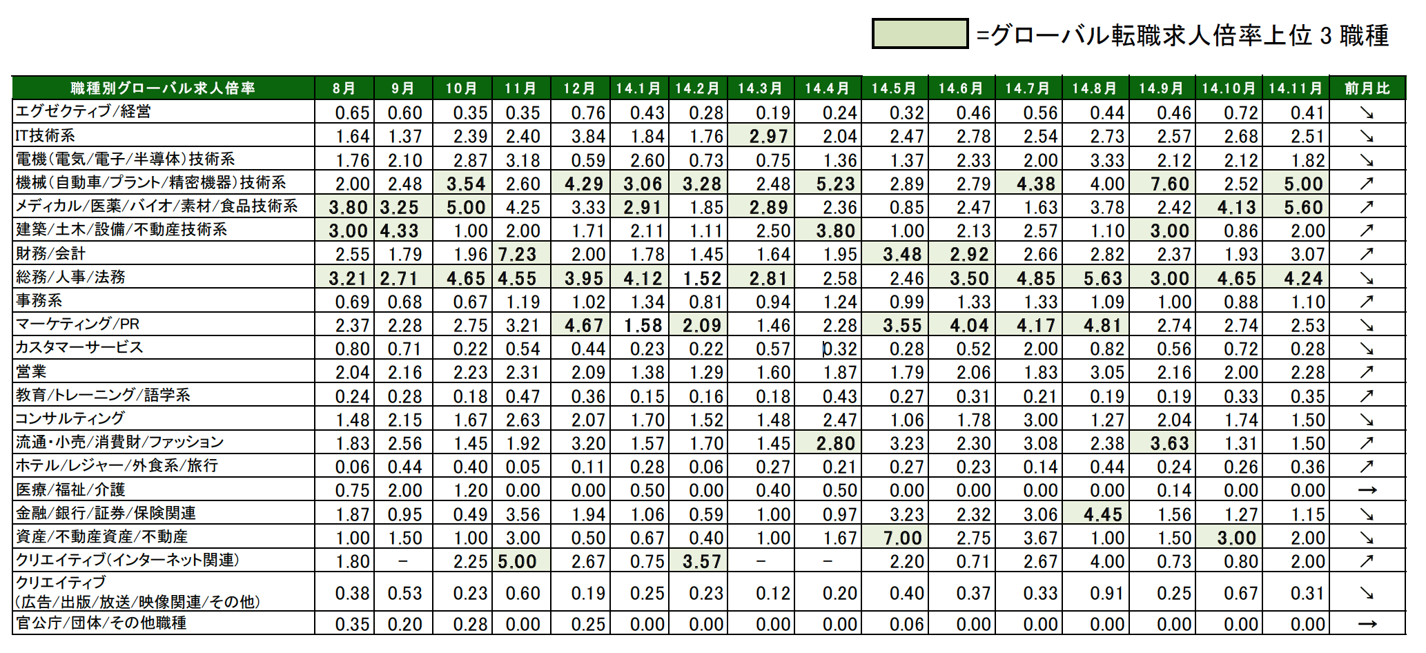 ヒューマンホールディングス株式会社の事業子会社で、バイリンガルのための転職・求人情報サイト Daijob.comを展開するダイジョブ・グローバルリクルーティング株式会社(本社:東京都新宿区、代表取締役:篠原 裕二)は、2014 年 11 月末時点でのグローバル転職求人倍率をまとめました。ここでいうグローバル転職求人倍率とは、2 ヵ国語以上の言語において、ビジネスレベル以上のスキルを条件とする求人と、そのスキルを持つ転職希望者の需要バランスを算出したものを指しています。<転職求人倍率=求人数÷転職希望者数>