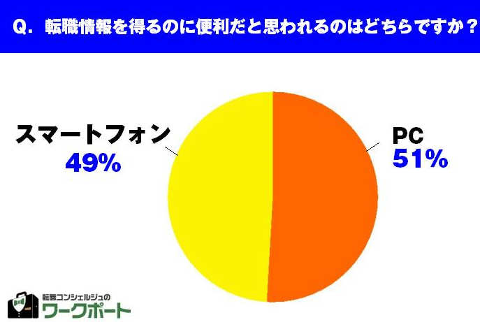 そんな中転職活動の情報収集において「PC とスマートフォンのどちらが便利」かについて調査してみました。結果、「PC が便利」と回答した人が51%、「スマートフォンが便利」と回答した人が49%とほぼ半々に割れました。