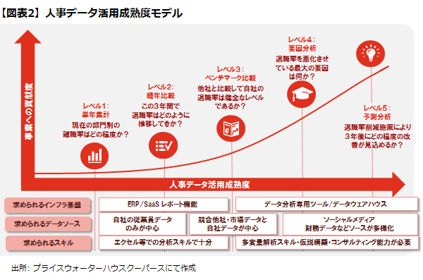 また、レベル4、5に示すような分析は、退職要因の分析のみならず、人員の需要予測や、採用時の候補者の選考基準、トータルリワードの設計に至るまで多岐にわたる。