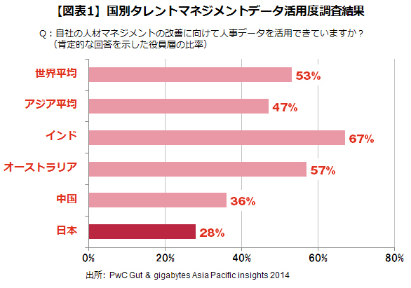 【図表1】に示す調査結果は、前述の調査から2年経った2014年に、全世界の役員層(執行役員を含む)約1130名に対する「人材データの活用度に関する満足度」を国別に示したものであるが、日系企業の調査結果を見てみると、全世界平均の53%の約半分である27%にとどまっている。