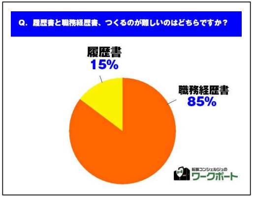 結果、「職務経歴書」と回答した人が 85%。理由としては「自分の一番の売りを何にしたらいいのかを企業ごとに考えるのが大変。」、「職務経歴書上でアピールできるものかどうかの判断が難しい。」や「異職の方に現在または今までの仕事について理解していただけるようなアピールの仕方が分からない。」などが挙がりました。