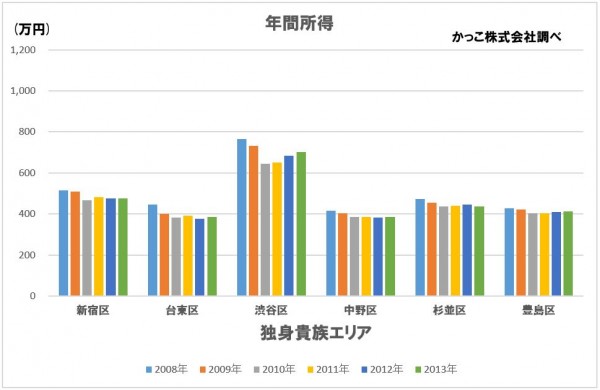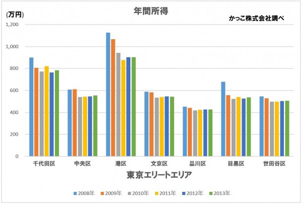 上の3つのグラフにも2008年から2013年までの所得の推移を付けており、一目瞭然ですが、5年間で最も大きな所得の下落を経験したワースト3区は、目黒区(21.0%減)、港区(20.0%減)、台東区(13.4%減)です。また東京23区のどのエリアにおいても、平均所得はずんずんと下がっています。