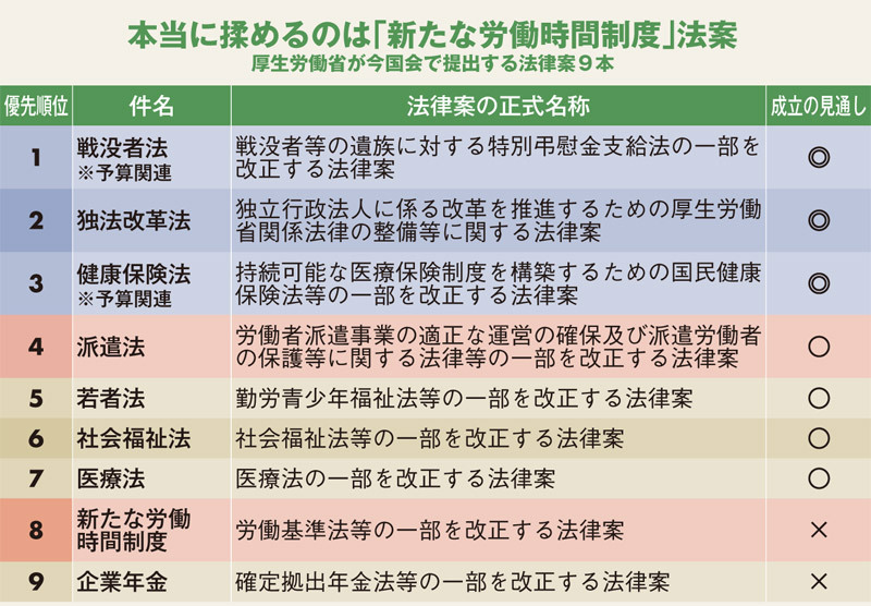 自信の根拠は二つある。第一に、厚労省が今国会で提出する9法案のうち、派遣法の優先順位が、戦没者法や健康保険法など重要3法案に次ぐ4番目と高いことだ。延長できるほど国会日程に余裕があることから、「6月中に参院を通過させたい」(前出の幹部)としている。