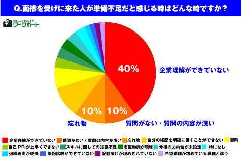 その次に多かったのが「質問がない・質問の内容が浅い」(10%)、「忘れ物」(10%)、「自分の経歴を明確に話すことができない」(10%)などの回答でした。