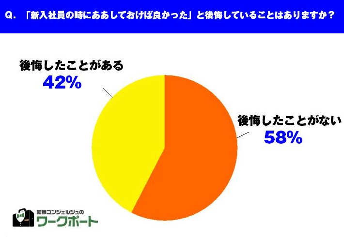 今回の調査の結果、半数近い 42%の人が「後悔したことがある」と答えています。“新入社員時代にやっておくべきだったこと”として最も多く挙がったのが「勉強・資格取得・業界知識を深める」といった内容のコメントでした。
