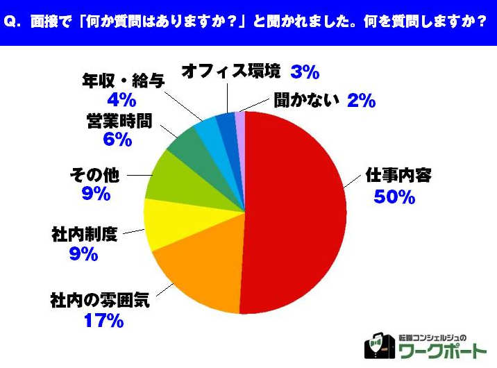 次に多かったのが、「社内の雰囲気について質問する」(17%)と言う意見。仕事内容を確認するのと同様、入社してからのイメージを掴みたいからという意見が多く見受けられました。「社内制度」(9%)について質問する人も多く、「社内制度が充実している会社は余裕があるように思うから」という意見もありました。