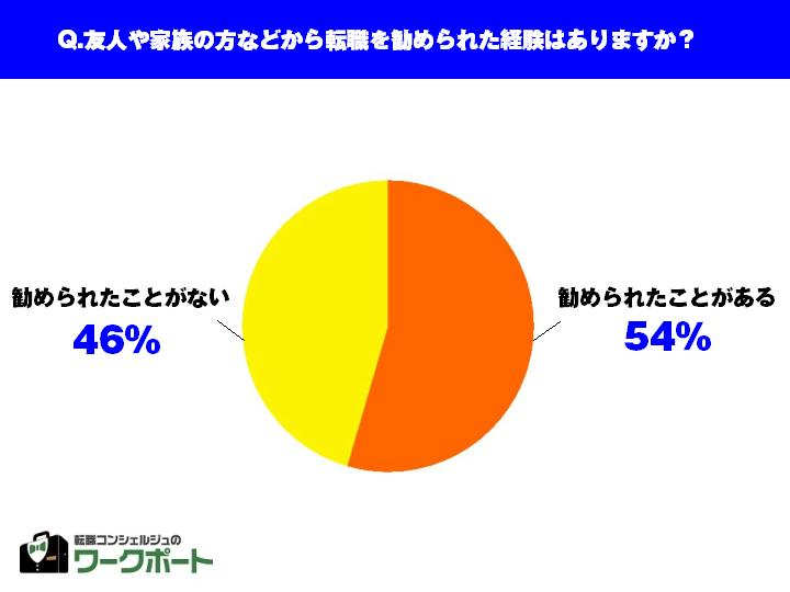 今回の調査によると、「友人や家族に転職を勧められたことがある」との回答が54%と「勧められた経験はない」という回答を若干上回る結果となりました。