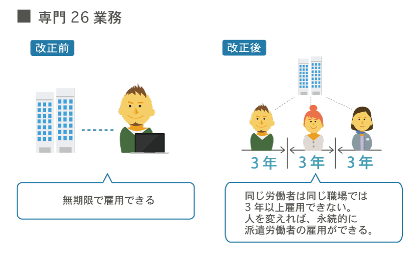 これまで、専門性を必要としない一般業務については、最長3年までしか働くことができませんでした。一方で、ソフトウェア開発や秘書、通訳や財務処理等の専門的な知識が必須となる職種については、「専門26業務」として扱われ、派遣期間の制限は原則としてありませんでした。