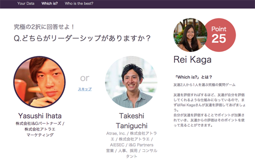 さらに特徴的なものとして、友だちを気軽に評価し合う「評価ゲーム」を用意しています。「仕事が早いのはどっち?」「一緒に飲みに行きたいのはどっち?」といった質問に対し、友だち2人の中から1人を選択するというものです。リリースから3か月で既に2万件近い評価データが蓄積されています。